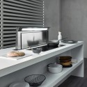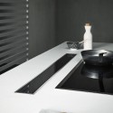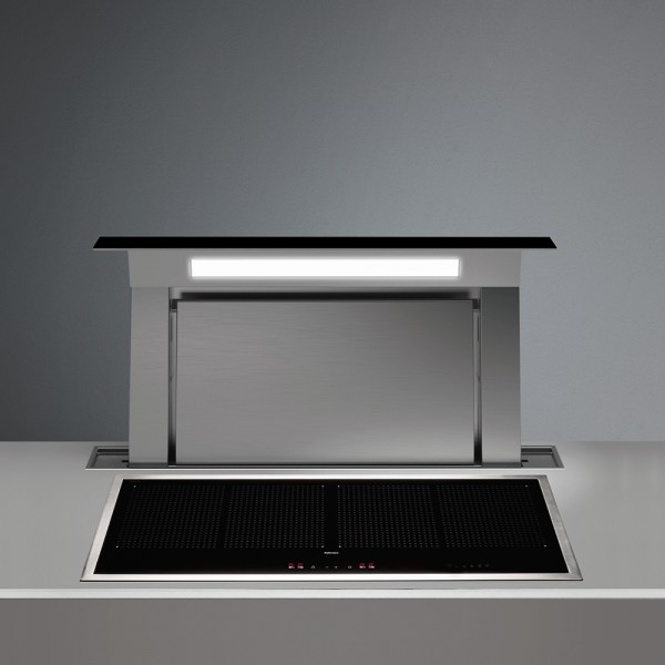 The hood Falmec Down Draft WORKTOP 90 black glass is made in stainless steel and tempered glass black. The device comes integrated into the work plan, behind the stove and, when turned off, looks like a shiny black stripe.