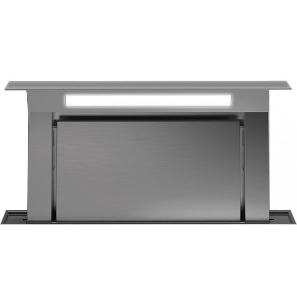 The Falmec Down Draft WORKTOP 120 stainless hood is made entirely of steel with a scotch brite finish. The unit is integrated into the worktop, behind the cooktop and, when turned off, looks like a simple metal band.