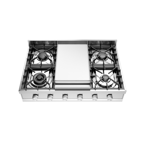 The base plate of the top is made of stainless steel and the knobs are in the new rounded (Milan) knob of the Professional Plus series, the same as the stoves but slightly smaller. The floors have always power on the knob, safety valve and cast iron burner grill.