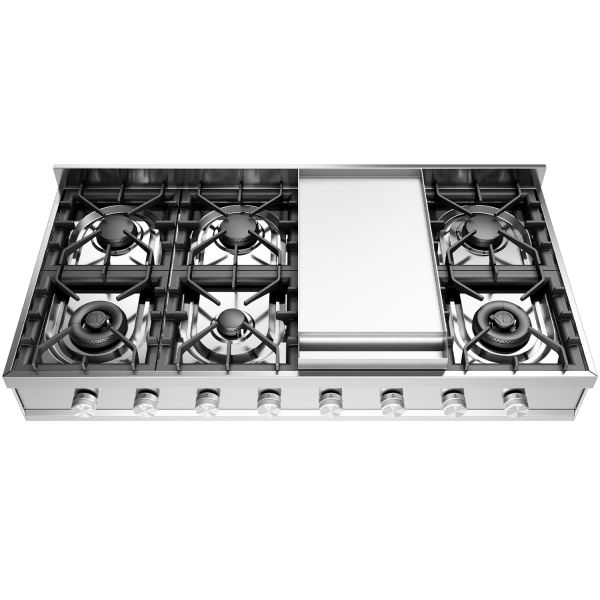 The base plate of the top is made of stainless steel and the knobs are in the new rounded (Milan) knob of the Professional Plus series, the same as the stoves but slightly smaller. The floors have always power on the knob, safety valve and cast iron burner grill.