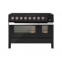 The kitchen PM09-MK of Ilve is part of the panoramagic line, a collection fromstrong and functional aesthetic, played on iconic elements, shapes and colors, as well as on a recognizable design and refined references to the brand: the design of the cast iron grids and the shape of the red marking on the knobs, recall the hexagonal motif of the ILVE logo.