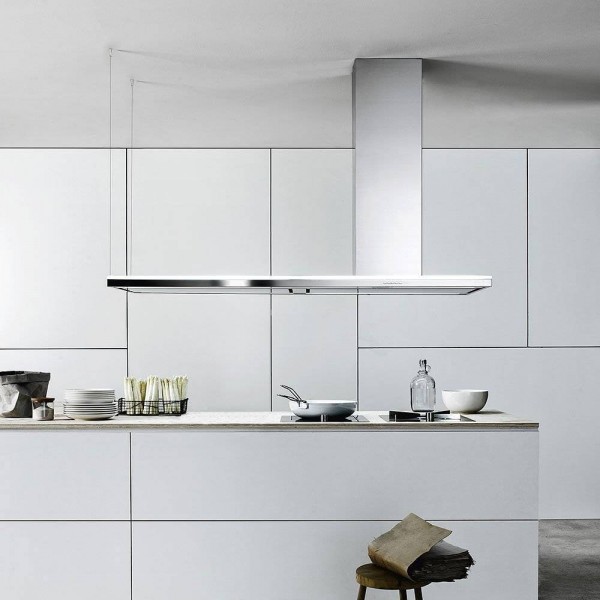 Realizzata in acciaio inox (AISI 304) con finitura scotch brite, che enfatizza gli angoli retti e le superfici piane, la cappa è dotata di un efficiente motore da 800 m3/h, con portata massima di 670 m3/h, gestito dalla pulsantiera elettronica posizionata a destra o a sinistra del lato frontale, a seconda della variante scelta. L'aspirazione di tipo perimetrale costringe fumi, vapori ed odori provenienti dal piano cottura ad attraversare sezioni di aspirazione posizionate lungo il perimetro della cappa. Questa soluzione permette di avere un piacevole effetto estetico anche della parte inferiore della cappa, nascondendo alla vista i filtri antigrasso, pur mantenendo una alta efficienza di aspirazione.