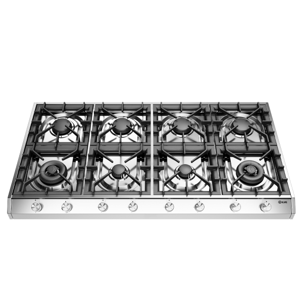 La piastra di base del piano è in acciaio inox e le manopole sono nella nuova manopola zigrinata tonda (Milano) della serie Professional Plus, la stessa dei fornelli ma leggermente più piccola. I piani hanno sempre accensione elettrica nella manopola, valvola di sicurezza e griglia bruciatore in ghisa. Vedere le opzioni di colata di seguito.
