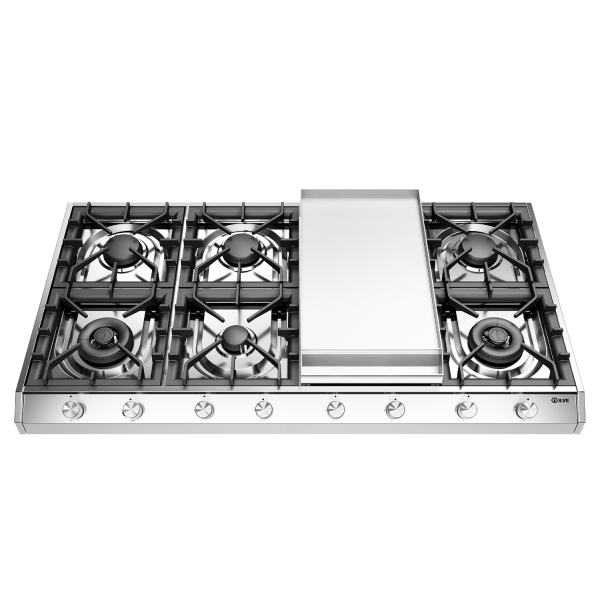La piastra di base del piano è in acciaio inox e le manopole sono nella nuova manopola zigrinata tonda (Milano) della serie Professional Plus, la stessa dei fornelli ma leggermente più piccola. I piani hanno sempre accensione elettrica nella manopola, valvola di sicurezza e griglia bruciatore in ghisa. Vedere le opzioni di colata di seguito.